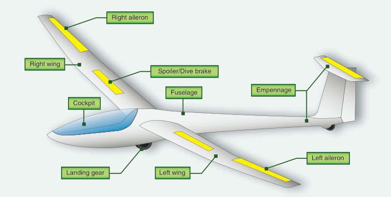 Below you'll find diagrams of a glider and its various parts. Terms like aileron, elevator, and spoilers will be used very frequently in your training so familiarize yourself with them.