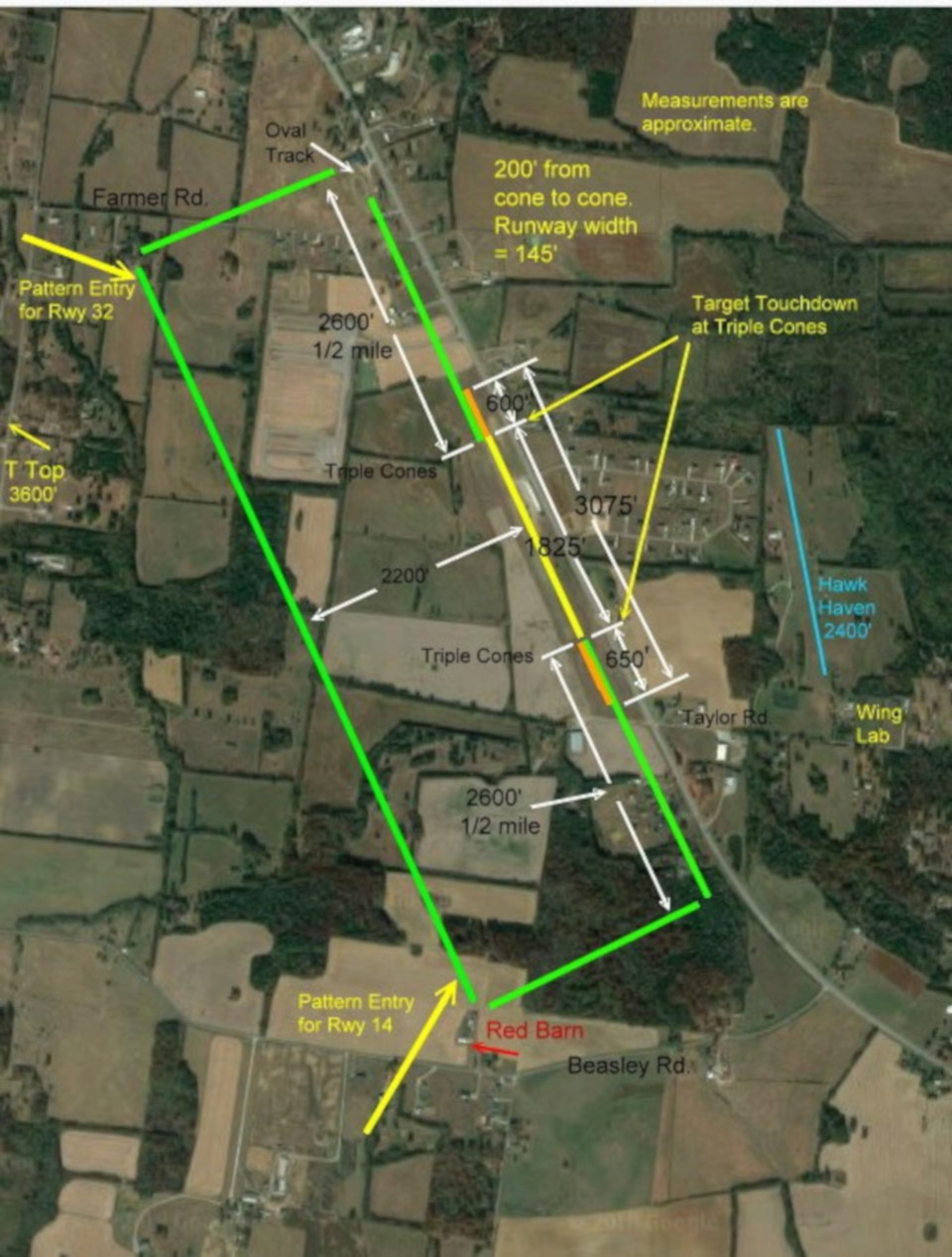 Below you will find a wonderful aerial pattern illustration made by CFI-G Tom Fleming. It shows the Eagleville Puckett (50M) runways 14 and 32 in yellow. The green lines to the left above, below, and to the left of the yellow runway line are the legs of the pattern.