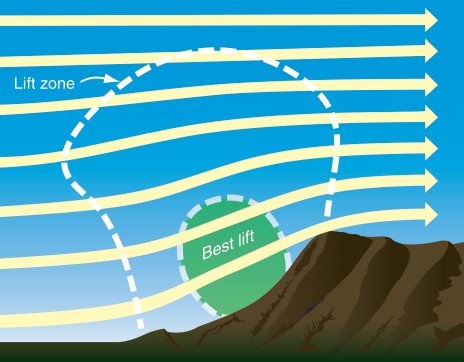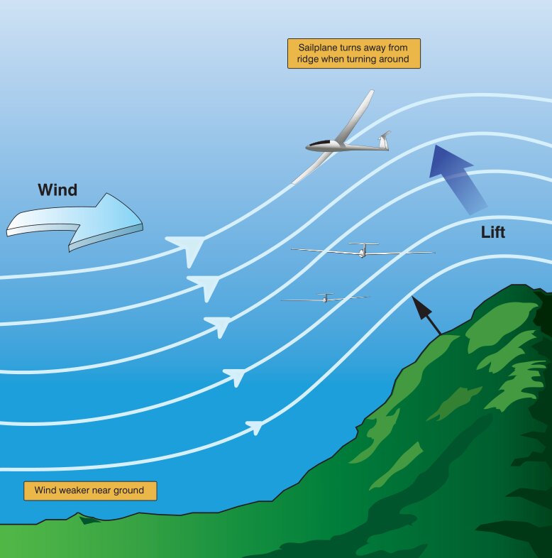 In the case of a ridge, wind from the windward side of the ridge will blow up the ridge and create lift just on the windward side of the ridge. Surface winds of 15-20 knots that are perpendicular to the ridge are ideal, but winds within 45° can provide adequate lift.